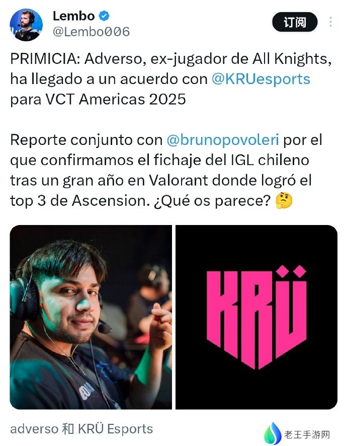 根据媒体人Lembo消息,前All Knights选手adverso已与KRU达成协议,将参加2025 VCT 美洲联赛。